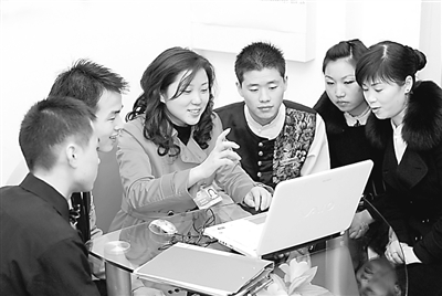 朱雪芹(中)正在接待来访的农民工。