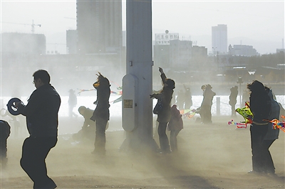 3月15日,山西太原汾河公园里,市民在风沙中放风筝。当日,山西部分地区遭受沙尘天气。省城太原天空灰蒙蒙的,空气中弥漫着沙土的味道。仁者 摄