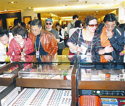 3月16日,“心印宝岛万人行”首发团的游客在台北故宫选购纪念品。