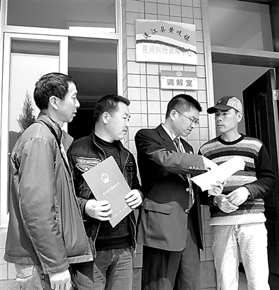 3月17日,黄岐法庭法官(左三)在指导农民工签订调解协议。