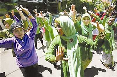 印尼将于4月9日举行国会选举,参加竞选的44个政党签署宣言将展开和平竞选活动。图为3月17日在印尼首都雅加达,一些民众在街头翩翩起舞,以表达对候选人的支持。肖劼 供图