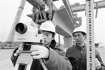 中铁十八局集团在京沪高速铁路施工中,高度重视工程测量工作,为工程提供强有力的技术保证。这是路桥公司测量人员正在进行精测。姜书范 摄