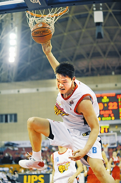 3月18日,在2008-2009赛季CBA联赛第49轮比赛中,广东东莞银行队主场以116比73战胜云南红河队,取得联赛20连胜。图为广东队球员朱芳雨大力扣篮。新华社记者 刘大伟 摄