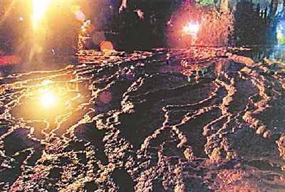 在九天洞,仔细欣赏那洞底暗河的流水,那红色的河床、那水哗哗地流,水声又是那样的美。那淡红、朱红和鲜红的河床、河水,又是那样铺彩烁金,色彩斑澜,五光十色,真叫人眼花缭乱,目不暇接,越看越神,越看越迷,看得如痴如醉。