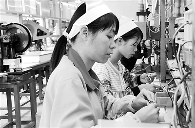返乡后重新就业的农民工在安装电子零件(摄于3月19日)。台商投资的广西钦州福晟电子有限公司自3月份以来,已招收农民工300多人。据了解,广西钦州为了促进返乡农民工在当地再就业,给当地所有企业提供岗位补贴,企业和农民工签订半年以上的用工合同,就可以得到每人1000元的财政补贴。新华社记者 王军伟 摄