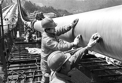 3月17日,建设沪蓉西高速公路的职工们正在离山谷底部600多米的空中,为被称作“世界第一公路高桥”的四渡河特大悬索桥进行防腐作业。