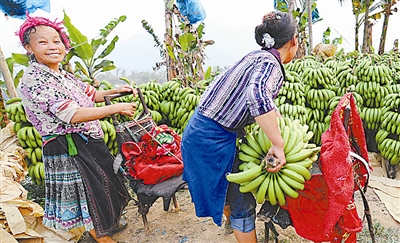 近年来,地处中越边境的云南省河口瑶族自治县立足当地资源优势,进一步改造和提升香蕉产业,走规模化、标准化种植香蕉的致富之路。目前全县香蕉种植面积达14万亩,年产量26万多吨,产值超过4亿元,香蕉产业已经成为河口县的支柱产业之一。新华社记者 蔺以光 摄