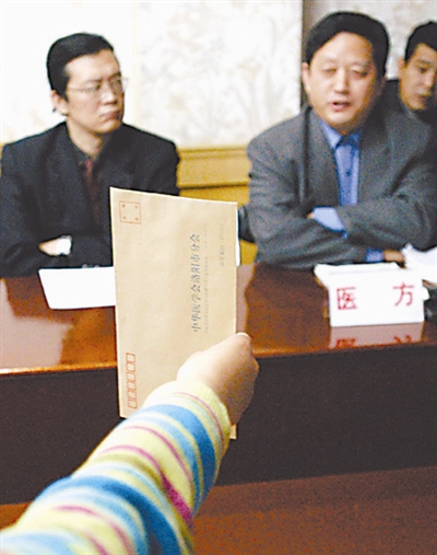洛阳市医学会组织了《医疗事故处理条例》实施后首例医疗事故技术鉴定会。 会前主持人向医患双方展示封存的装有专家鉴定组人员名单的信封。 王君 摄