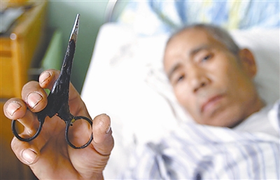 在某医科大学第二医院胃肠外科住院部病房,53岁的甄占民拿着从他肚里取出的10多厘米长的已经生锈的医用止血钳悲愤不已。其19年前因患肠梗阻在县医院接受了肠粘连松解手术,他说一定是那次手术大夫把钳子留在了肚里。19年来他腹中常常隐隐作痛,多次到医院检查均未查出病因,腹痛难忍的他在县医院拍片发现:腹中直肠处竟有一把医用止血钳。 尉战魁 摄