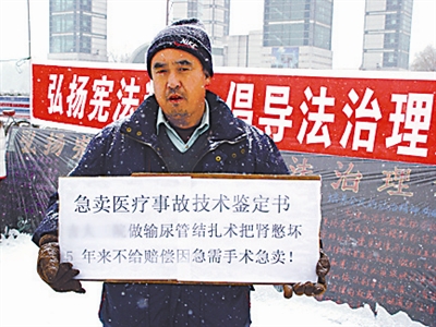 吉林一市民街头出卖自己的医疗事故鉴定书。 朱万昌 摄