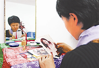 吉林某电视台一女主播坐在梳妆台前看以前的照片。她因被长春某医院误诊,做化疗,头发都掉光。白桄 摄