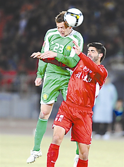 3月22日晚,北京国安队在主场迎战本赛季重返中超的重庆力帆队。图为国安队14分钟由乔尔·格里菲斯先拔头筹。 本报记者 许之丰 摄