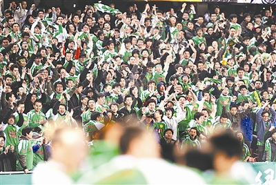 商务开发取得进展的新赛季中超吸引了众多球迷的关注。图为3月22日晚,北京国安队在主场迎战重庆力帆队时观众们为进球欢呼。本报记者 许之丰 摄
