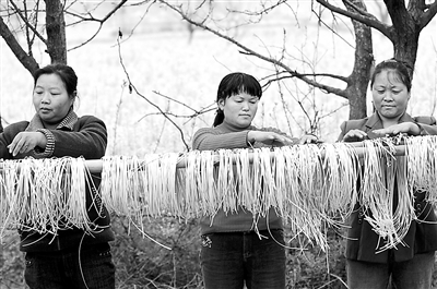 3月20日,返乡农民工夏菊芳(中)正在晾晒竹篾丝。四川省梓潼县黎雅镇根据返乡女性农民工的特点,积极组织她们在家门口进行竹帖加工,在白沙村,今年从事竹帖加工的就有50余人,为成都崇州市出口企业加工食品竹帖盒包装,预计收入5万余元。成和平 摄