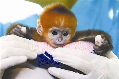在澳大利亚悉尼,一只刚出生的长尾叶猴艾尔克由于其母亲拒绝喂奶,所以被塔朗加野生动物园医院收养。图为3月24日,出生仅仅5天的艾尔克首次在公众面前露面。肖劼 供图