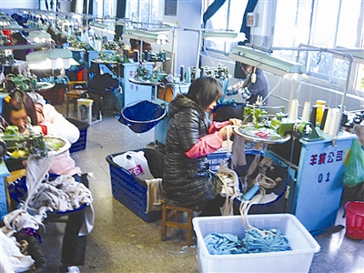 虽然订单大为减少,但桐庐羊绒针织有限公司仍然坚持生产。图为公司车间一角,女工们正在“穿针引线”。本报记者 刘津农 摄