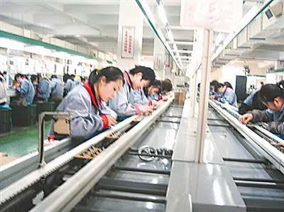 受金融危机影响,一些产品的出口市场寒风阵阵,但浙江阳光集团股份有限公司生产的节能灯具出口订单不减反增。图为工人们正在车间组装节能灯具。 本报记者 刘津农 摄