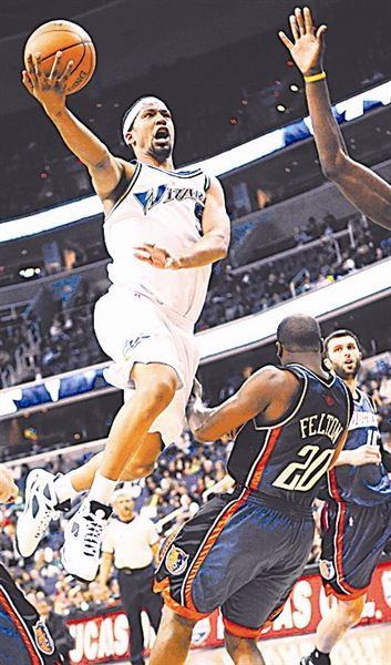 3月25日,在2008-2009赛季NBA常规赛中,华盛顿奇才队主场以95比93战胜夏洛特山猫队。图为奇才队球员麦奎尔(左)突破上篮。