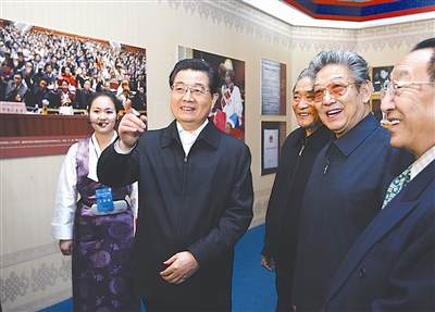 唐蕃会盟碑照片、元代藏族地区略图、金瓶掣签所用金本巴瓶复制品等证实西藏自古就是中国不可分割一部分的珍贵史料,吸引了胡锦涛等的目光。带着锁链劳动的农奴照片、向领主借贷的高利贷利率示意图、残酷迫害农奴的刑具实物等诉说旧西藏广大农奴悲惨遭遇的展品,让胡锦涛等神色凝重。记述和平解放西藏十七条协议的汉藏文本、揭露西藏上层反动集团1959年武装叛乱真相的档案、表现翻身农奴焚烧卖身契和地契的场景等再现西藏和平解放与民主改革历史进程的展览,胡锦涛等看得格外专注。