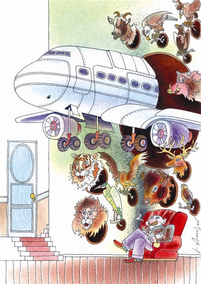 漫画家的首要本领就是要能天马行空地想象,没有想象力的人成不了优秀的漫画家。打个老虎老鹰的算什么英雄?打飞机才叫真本事,本来是让人一笑的作品,可是当我们看到画中人的衣服有些军服的意思时,忽地让人又有了些沉重。那浓密的胡子下是怎样的一个“血腥”人生啊,那一个个标本,倏然而成为一个个证物。人不能与动物为敌,更不能与人为敌,人不能打动物,更不能打飞机。但愿这只是一幅漫画,只是一个想象力丰富的玩笑;但愿那些动物和飞机只不过是纸糊的模型;但愿画中那个怡然自得的家伙只是一个爱吹牛造假的人。