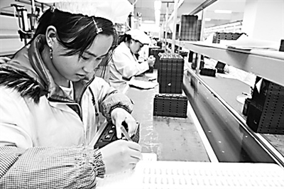 湖北省建始县返乡农民工邱彬(前)在该县一家公司工作(3月29日摄)。邱彬2008年在广东省务工,2009年2月在本县实现再就业。
