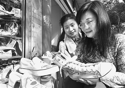 湖北省黄石市下岗女工胡文生,自幼酷爱美术。不久前她在该市消防路开了一家颇受年轻人喜爱的手绘鞋店。自开张至今,她已售出手绘鞋350多双。邱孝威 摄