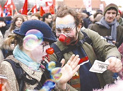 即将举行的20国集团伦敦峰会对于遭受金融风暴冲击的民众来说,是他们表达不满的重要场所。3月31日,德、法、意等欧洲国家有数万人游行示威。图为在德国首都柏林,小丑在街头边游行边表演。肖劼 供图