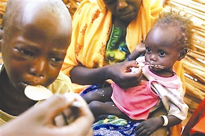 联合国警告说,苏丹政府驱逐驻达尔富尔地区的国际援助人员将造成110万难民得不到食品援助。图为在西达尔富尔地区,营养不良的儿童正在“无国界医生”组织管理的救助站进食。顾兵 供图