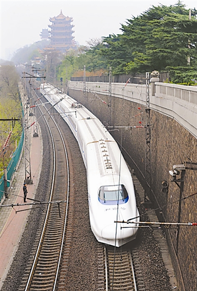 4月1日,武昌至上海的D3012次动车组驶经黄鹤楼。新华社记者 程敏 摄
