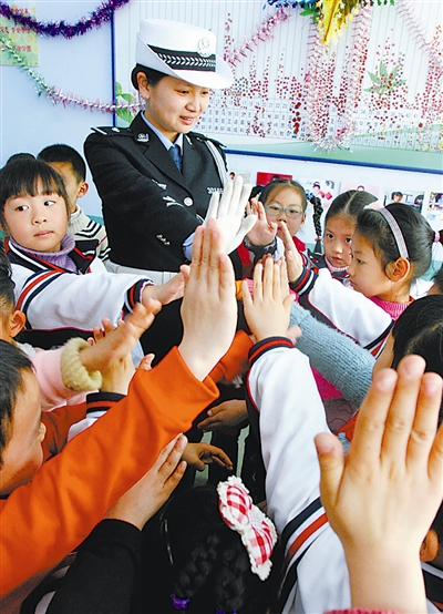 3月29日,辽宁鞍山市公安局交警支队女子礼宾大队警察在青华小学教学生们学习辨认交通手势。当日,辽宁鞍山市公安局交警支队开展“安全教育进校园”活动,交警通过交通图板展示、辨认交通标识、学习交通手势等,提高学生的交通安全知识和自我保护意识。新华社发 蔡冰 摄