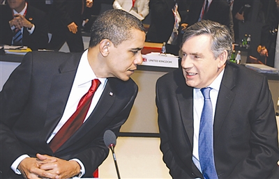 4月2日,在英国伦敦展览中心,美国总统奥巴马(左)与英国首相布朗出席二十国集团第二次金融峰会第一阶段会议。新华社发