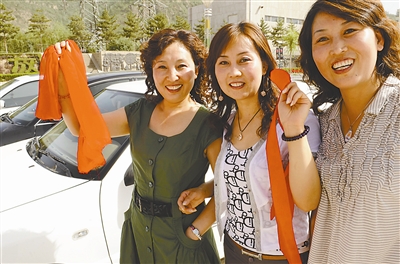 6月6日,参加爱心送考行动的延安市民贺建娜、贺建萍,贺建华三姐妹,在启动现场挥动红飘带。