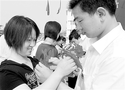 6月5日,安徽省淮北矿业集团袁庄煤矿采煤工杨佳(右一)和爱妻姜小妹在相互配戴象征着家庭幸福的“安全花”。