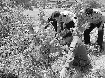 图为5月7日,武汉市东西湖区公安分局径河派出所民警正在鱼塘埂上铲除罂粟原植物。