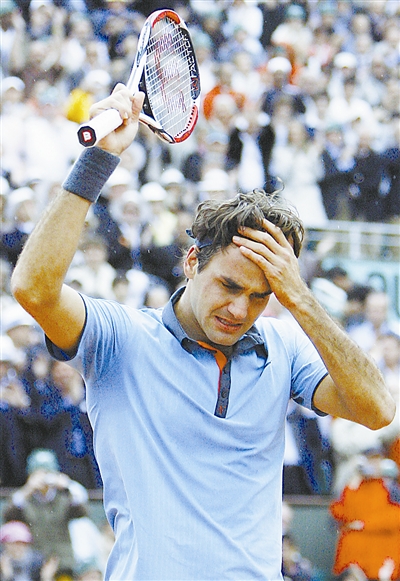 6月7日,在2009法网男子单打决赛中,瑞士选手费德勒直落三盘战胜瑞典选手索德林,首次夺得法网冠军,并成为夺得五大公开赛冠军的又一人。图为费德勒获胜后激动不已。
