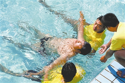 6月4日上午10时,在北京市青年湖公园水上世界,一场减溺演习正在进行,从发现到救援上岸,整个过程不过一分钟时间。据公园负责人介绍,青年湖公园水上世界是北京三环内唯一一家大型室外游泳场,水域面积3000多平方米,可容纳1200多人游泳,为保证游客安全,他们配备了10名专职救护员,并加强了对池水的消毒过滤,以一流服务迎接暑期游客高峰的到来。本报记者 杨登峰 摄