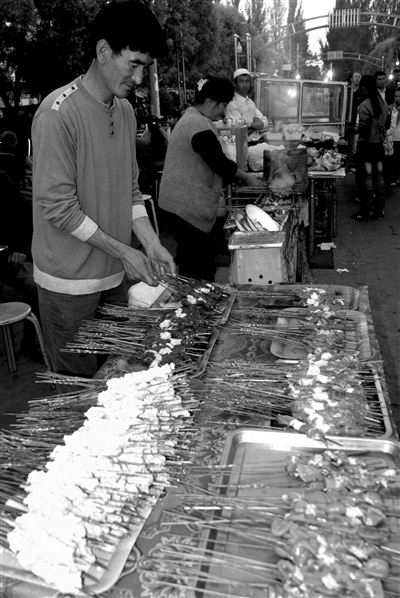 6月2日晩,下岗职工艾力·哈力与妻子一起在县城“下岗职工就业一条街”上摆夜市摊。