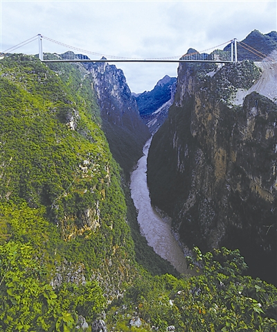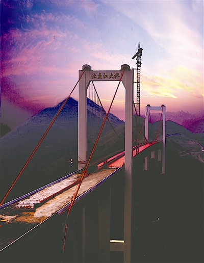 坐落在关兴高速公路上的北盘江特大桥,在国内首次采用双向预应力砼加劲板梁设计,横跨号称“世界大裂缝”的花江大峡谷,是预应力混凝土加劲梁悬索桥,主跨388m,为贵州省已建桥梁中的最大跨径。桥面至江面高达405m,横跨北盘江大峡谷,是世界上最高的桥梁。