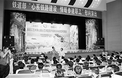 铁道部根据今年铁路建设任务需要,集中人力财力物力,深入开展以“心系铁路建设,情暖参建职工”为主题的送精神、送文化、送实物、送关怀到铁路工程建设工地慰问活动。6月2日晚上7点30分,江苏镇江市大礼堂内,由中华全国铁路总工会组织的“火车头职工艺术家”心连心艺术团慰问演出隆重举行。(孙清华 郭争鸣)