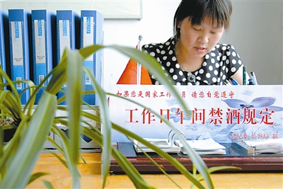 图为6月10日,在河南新蔡一机关办公室拍到的“工作日午间禁酒规定”提示牌。