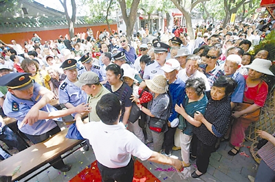 6月10日上午,国子监文化节正式开幕。作为活动的重要内容之一,免费发放4万本《论语》,引起了北京市民的巨大热情,一度引发“争抢”。截至上午11时许,已经发放了2000余本书。林晖 摄