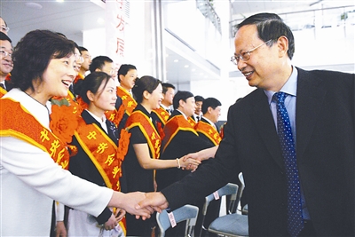 中国移动通信集团公司总裁王建宙与劳模代表亲切握手