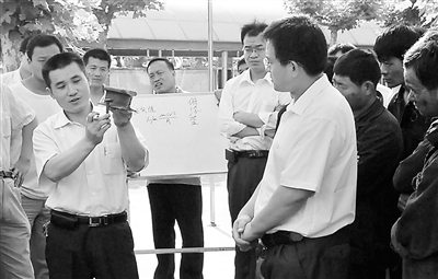 6月9日,新陶阳矿业公司技术能手王树庆在轨道工练兵场上讲解矿井轨道铺设技术。山东新陶阳矿业公司将安全技术课堂搬到了练兵场上,由技术能手担任老师,针对员工在实际操作中出现的问题现身说法,现场指导,改变了以往技术培训形式单一、内容枯燥等问题,深受员工的欢迎。张修东 李明生 摄