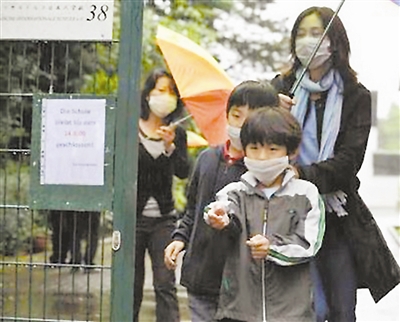 6月11日,德国西部城市杜塞尔多夫一所日本人学校共有27名中小学生感染了甲型H1N1流感。该校学生总数为571人。根据德国卫生部门指示,学校将于15日至19日停课。图为11日家长领着孩子离开学校。