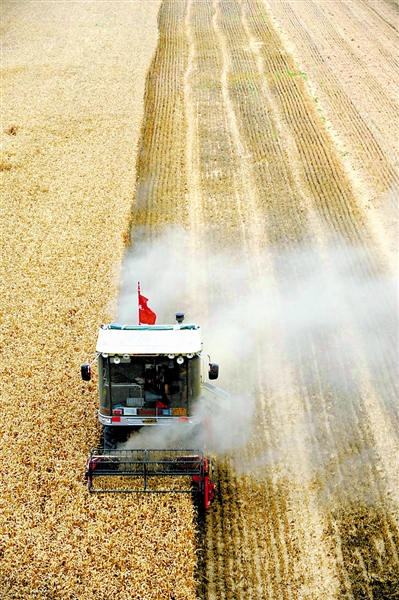 全国夏收小麦丰收已成定局,将实现新中国成立以来首次连续第六年增产,预计总产超过1225亿公斤。这是6月5日,收割机在河南省原阳县桥北乡收割小麦。