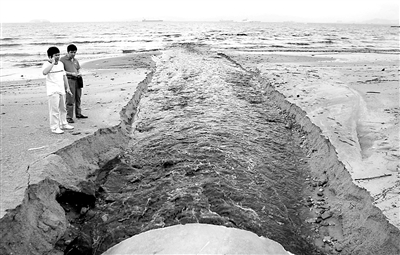 6月10日下午6时许,福建省厦门市书法广场海滩,一个近两米口径的管道,“哗啦啦”地往大海中排放污水。污水所流经的海面颜色发黑,空气中弥漫着一股难闻的味道。附近海面以及沙滩中的石头都被染黑,周围的群众惊呼太不可思议。据了解,此处排水管是附近村庄的雨水管道。雨天时,村庄里收集的雨水都通过这条管道汇入大海。莫风摄
