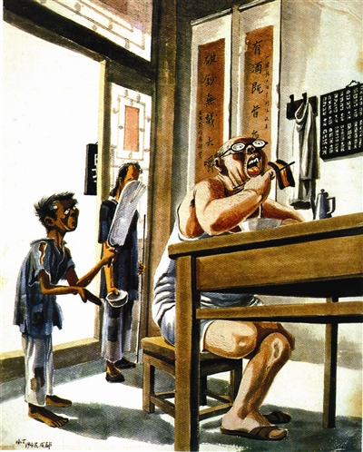 上世纪三四十年代,日益成熟的丁聪和其他漫画家一起用如椽之笔战斗在抗击日寇宣传的最前沿。1945年,丁聪目睹了抗战胜利后内战烽火又起,劳苦人民再次陷入水深火热之中的惨状。画家回绝了美国友人邀请赴美工作的盛情。丁聪旗帜鲜明地用漫画讽刺国民党的腐败,揭露反动派的倒行逆施。丁聪在1946年还为陈白尘剧作《州官图》重新设计了舞台布景和人物造型,画家将铜钱设计成大门,让剧中人物穿上军阀服饰,这种大胆夸张、内涵深隽的舞台策划使得演出效果甚为轰动。因此,丁聪也引来了国民党特务的“调查”,“小人物”顿时成了反动派的“眼中钉”。