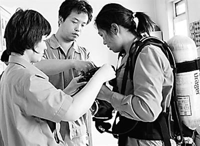 6月5日,山东莱钢集团动力部水力车间员工商海林(右)转岗到水处理班,急于想掌握操作技术的她刚报到,就被班长李杰(左)“训练”上了安全:标准化用语、标准化着装、标准化行为、标准化作业……直到她能熟练作答班长才松手。与她同时接受转岗安全培训“四标法”的还有另两名员工。他们说:学会使用压缩空气呼吸器,上岗后心里更有底了。 卢燕华 摄