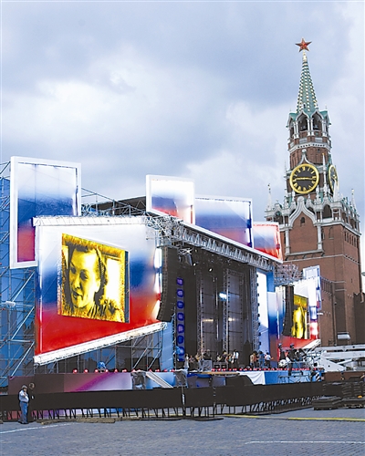 6月11日,在俄罗斯首都莫斯科红场,演员在搭建的舞台上排练节目,准备庆祝俄罗斯日(国庆节)。1990年6月12日,俄罗斯联邦第一次人民代表大会通过了俄联邦国家主权宣言。后来,这一天被定为俄罗斯独立日,2002年后改称俄罗斯日。新华社记者 鲁金博 摄