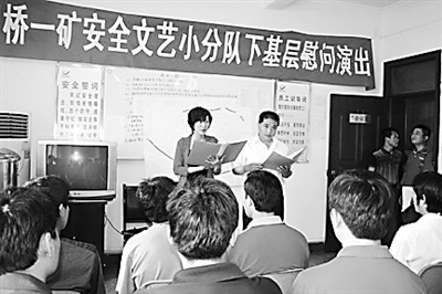 为推进“安全生产月”活动的开展, 日前,皖北煤电集团公司刘桥一矿安全小分队慰问采煤一线员工。这个小分队以“情系员工、共铸安全”为主题,提醒矿工们加强安全自保互保意识,近年来,刘桥一矿利用理论下基层、安全知识征答、班前文艺演出等不同载体,开展安全宣传教育活动,进一步增强了一线员工的安全素质。图为现场演出情景。 王新喜 摄